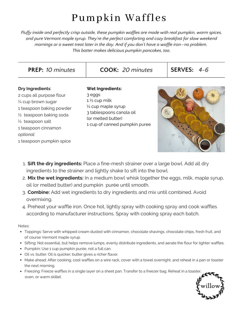 Fluffy inside and perfectly crisp outside, these pumpkin waffles are made with real pumpkin, warm spices, and pure Vermont maple syrup. They’re the perfect comforting and cozy breakfast for slow weekend mornings or a sweet treat later in the day. And if you don’t have a waffle iron—no problem.